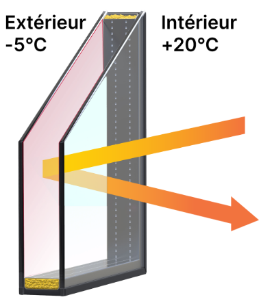 De ce fait, le double vitrage empêche le froid de rentrer et la couche de sel métallique empêche la chaleur de sortir.